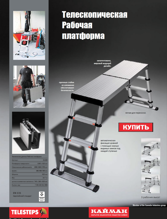 Телескопическая рабочая платформа Telesteps (Швеция) Платформа для разных типов работ. Переносится в одной руке. Рабочая платформа имеет множество преимуществ для любого, кто работает на высоте в течение долгого времени. Теле… Читать дальшескопическое решение позволяет устанавливать три уровня высоты платформы. Спина и плечи не находятся в постоянном напряжении, а значит повышается эффективность, безопасность и производительность труда. Лёгкий вес платформы и простота сборки позволяют быстро перейти на новое рабочее место. Характеристики: Размер платформы, мм 1360×410 Высота платформы, мм 880/680/500 Рабочая высота, мм 2600/2400/2200 Размер сложенной платформы , мм 740/280/620 Ширина, мм 620 Вес, кг 17.4 Наше качество – Ваша безопасность Полный каталог продукции на: http://telesteps.su/?page_id=4 Россия, 620042, Екатеринбург, ул. Ломоносова, д. 55 Б, офис 14, тел./факс: (343) 382-69-10, 381-59-97 E-mail: ural@kaiman.ru